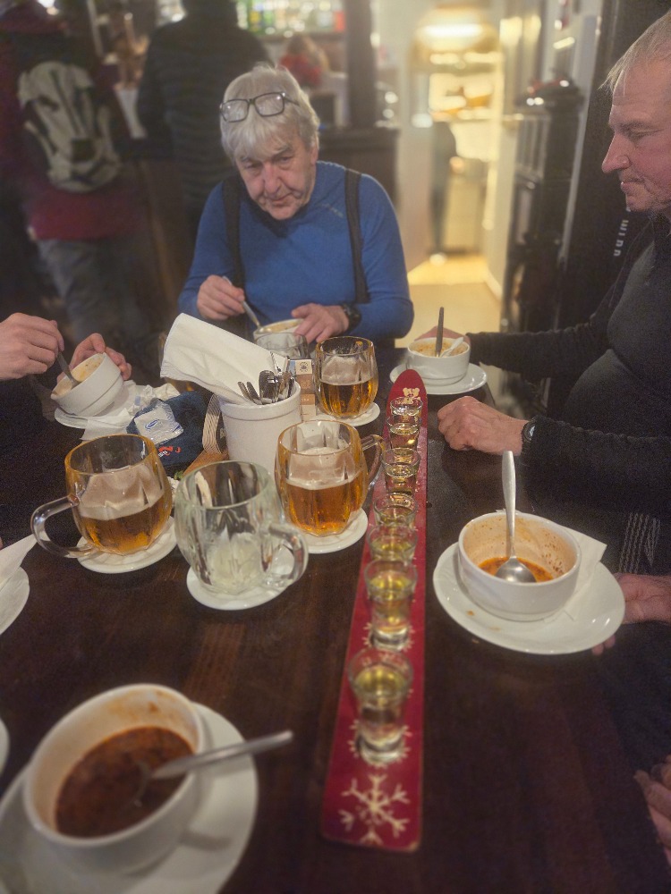 V cíli je dobrá nálada a všichni vypadají spokojeně že jsme se hejbli. Přesouváme se po Krkonošské magistrále směrem do Vítkovic v turistickém tempu. Asi po deseti kilometrech první zastávka na pivo a polévku. Další je plánovaná zastávka na pozdní oběd v chatě Tereza. Vydržíme v dobré náladě až do večerních hodin s výbornou obsluhou dobrým jídlem a kouskem piva. Po návratu na chalupu a posezení u vybraných delikates, pivka si dáme kulečníkovou hru karambol.